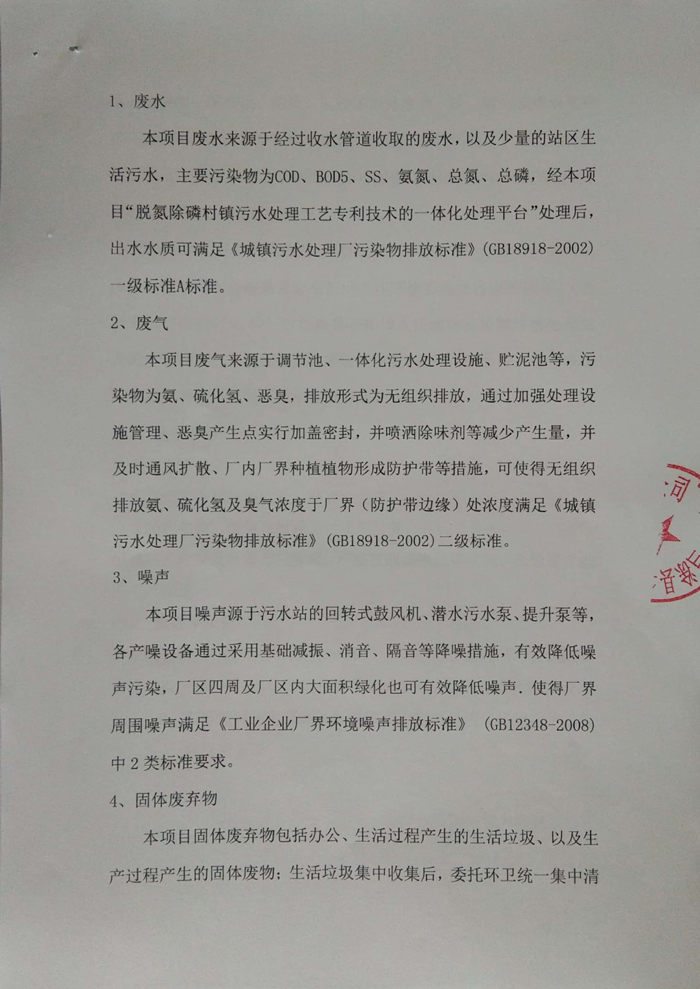 本項(xiàng)目廢水來源于經(jīng)過收水管道收取的廢水,以及少量的站區(qū)生活污水,主要污染物為COD、BOD5、SS、氨氮、總氮、總磷,經(jīng)本項(xiàng)目“脫氮除磷村鎮(zhèn)污水處理工藝專利技術(shù)的一體化處理平臺(tái)”處理后,出水水質(zhì)可滿足《城鎮(zhèn)污水處理廠污染物排放標(biāo)準(zhǔn)》(GB18918-2002)一級(jí)標(biāo)準(zhǔn)A標(biāo)準(zhǔn)。