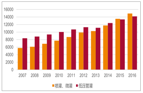 目前,我國水澆地主要用于種植小麥、玉米、大豆等糧食作物,適合發(fā)展噴灌。此外,2013年,我國有園地1.45億畝,草場22.5億畝,草場適宜發(fā)展噴灌,園地主要以種植蔬菜、瓜果等經(jīng)濟(jì)作物為主,事宜發(fā)展噴灌和微灌。假設(shè)未來噴灌、微灌占灌溉面積的比重達(dá)到發(fā)達(dá)國家水平,即占到耕地和園地的比重達(dá)到70%,則我國噴灌和微灌的推廣面積將高達(dá)5.22億畝,我們假設(shè)牧草地實(shí)現(xiàn)噴灌的比例達(dá)到10%,則可實(shí)現(xiàn)噴灌面積達(dá)到2.25億畝。合計7.47億畝,而2016年,我國噴灌和微灌面積合計僅有1.5億畝左右,未來成長空間巨大。