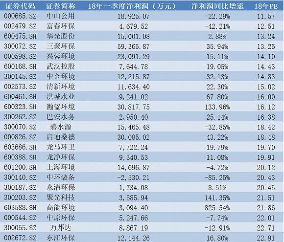 界面新聞梳理了全部環(huán)保板塊上市公司一季報業(yè)績以及當前情況下的市盈率水平,具體情況如下表所示(下表中“預測PE”為根據(jù)多家券商一致性預測出的2018年凈利潤及5月7日收盤價所計算出的市盈率):