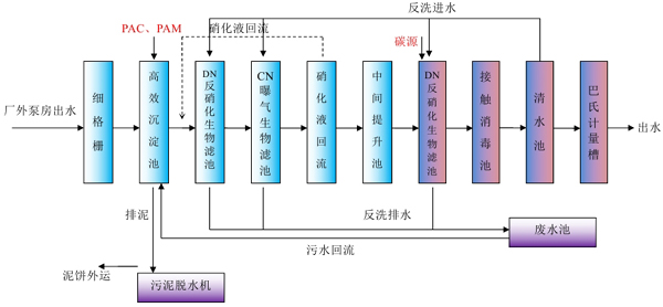 馬鞍山城鎮(zhèn)南部污水處理廠規(guī)劃設(shè)計(jì)總規(guī)模9.5萬(wàn)噸/天,現(xiàn)狀規(guī)模只能處理4.5萬(wàn)噸/天。根據(jù)現(xiàn)狀進(jìn)水水量監(jiān)測(cè),其水量已超過(guò)目前污水處理廠處理量的20%,須對(duì)馬鞍山城鎮(zhèn)南部污水處理廠擴(kuò)建,擴(kuò)建處理規(guī)模5萬(wàn)噸/天污水處理廠一座。本工程采用先進(jìn)的“高效沉淀池+中置硝化三級(jí)生物濾池”的組合工藝,再經(jīng)過(guò)末端處理出水達(dá)到“準(zhǔn)Ⅳ類(lèi)標(biāo)準(zhǔn)”后排放至朝陽(yáng)溝。本工程脫水后污泥(80%)運(yùn)至指定地點(diǎn)進(jìn)行處置。