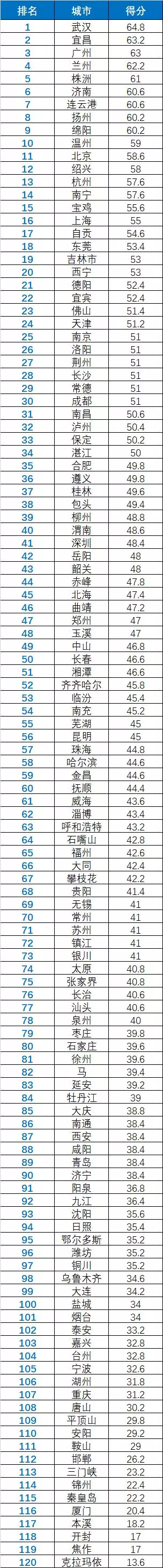 2019年,環(huán)保公益組織公眾環(huán)境研究中心通過搜集政府公開信息,對全國120個環(huán)保重點城市的水質(zhì)信息公開進行評價,該表為水質(zhì)信息公開指數(shù)排名,排名越靠前公開質(zhì)量越高。