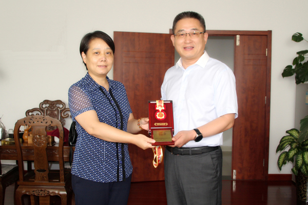 鄭俊從馬鞍山科技局局長王焰(左)手中接過紀念章