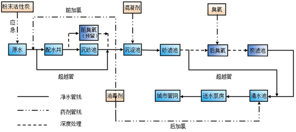 重慶市悅來水廠二期工程設計規(guī)模20×104m3/d,位于重慶市渝北區(qū)悅來街道及雙龍湖街道,主要工程內(nèi)容包括取水工程、凈水工程、輸配水擴建工程。水源地選擇在水量充沛、水質(zhì)較好的嘉陵江悅來段,一期取水工程已按40.0萬m3/d進行土建,本期設備增容20.0萬m3/d。凈水工程主要生產(chǎn)構筑物按20.0萬m3/d建設,凈水廠工藝流程采用常規(guī)凈水處理+深度處理工藝。常規(guī)凈水處理工藝為沉砂+絮凝沉淀+過濾+消毒,深度處理工藝為O3-BAC。管網(wǎng)輸配水能力按2020年60.0萬m3/d總體布置,分期分步實施。