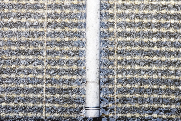 保持足夠的溶解氧濃度是維持曝氣生物濾池內(nèi)好氧生物膜高活性、對有機物和氨氮的高去除率的必備條件。曝氣系統(tǒng)采用豐字型曝氣形式,主要由曝氣分配器及支管、單孔膜空氣擴散器、固定支架等單元構成。