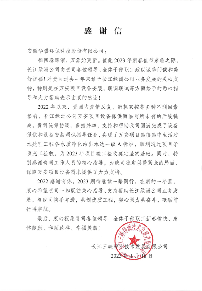感謝信寫道:“2022 年以來,受國內(nèi)疫情反復(fù)、能耗雙控等多種不利因素影響,長江綠洲公司萬安項(xiàng)目設(shè)備保供面臨前所未有的嚴(yán)峻挑戰(zhàn)。華騏環(huán)保統(tǒng)籌協(xié)調(diào)、多措并舉,支持和幫助我司圓滿完成了設(shè)備保供和設(shè)備安裝調(diào)試指導(dǎo)任務(wù),實(shí)現(xiàn)了萬安項(xiàng)目集鎮(zhèn)集中生活污水處理工程各水質(zhì)凈化站出水達(dá)一級(jí) A 標(biāo)準(zhǔn),順利通過項(xiàng)目子項(xiàng)完工驗(yàn)收,為 2023 年項(xiàng)目竣工驗(yàn)收奠定堅(jiān)實(shí)基礎(chǔ)。同時(shí),特別感謝貴司工作人員的精心指導(dǎo),為我司穩(wěn)定供需緊張的局面保障萬安項(xiàng)目設(shè)備需求提供了大力支持。”