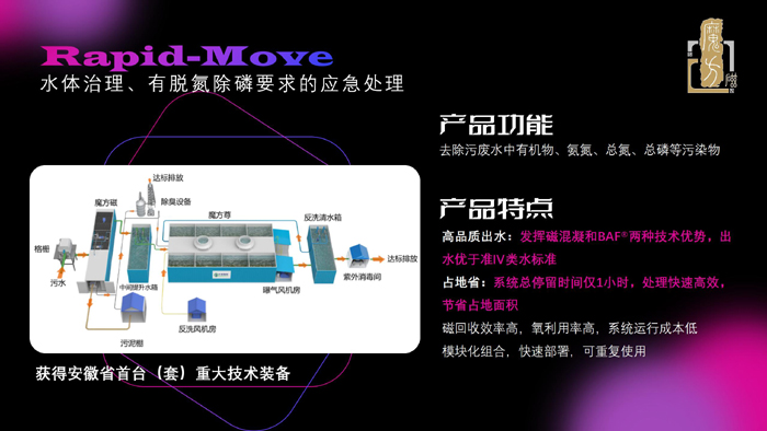 如遇同時要求脫氮除磷的提質(zhì)增效或應(yīng)急處理項目,可選用由魔方磁和魔方尊組合成的“Rapid-Move”系統(tǒng),該系統(tǒng)曾獲得安徽省首臺(套)重大技術(shù)裝備,其發(fā)揮了磁混凝和BAF兩種技術(shù)優(yōu)勢——系統(tǒng)總停留時間僅1小時,占地面積??;出水水質(zhì)為準四類標準;模塊化組合,快速部署,可重復(fù)利用。