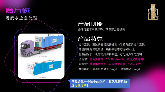 狹小空間亦可快速化濁為清——針對水體治理,以及污水處理廠、工業(yè)廢水廠應(yīng)急處理場景,要求快速解決污水感官問題,以及去除TP的情況下,可以選用魔方智水的魔方磁,其功能是去除SS和TP,它有車載式和集裝箱式兩種形式,采用磁加載混凝澄清技術(shù),表面面負荷 20 以上、停留時間是常規(guī)沉淀技術(shù)的 1/3-1/4,占地小,處理效率高。高度集成了加藥、污泥脫水以及控制系統(tǒng),快速部署,快則1天,慢則3天就即可見效,處理效果立竿見影。